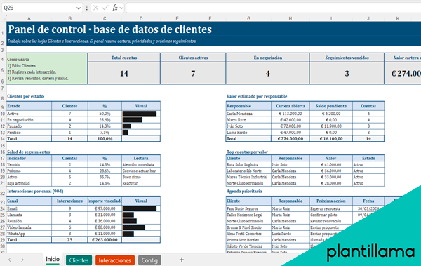 Después, usa la hoja de Interacciones como tu historial de seguimiento: cada llamada, email, reunión o mensaje debe quedar registrado con fecha, canal, resultado y siguiente acción. Así podrás entender rápidamente el contexto de cada cliente antes de volver a contactarlo, mantener actualizado el proceso comercial y saber qué contactos requieren atención prioritaria.