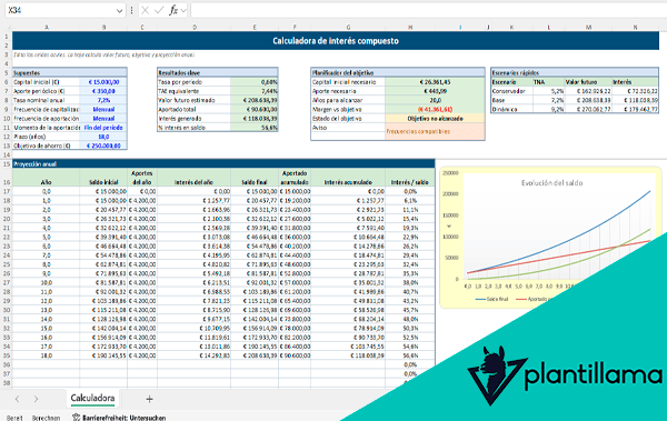 Modelo de interés compuesto en Excel orientado a planificar objetivos de ahorro con aportaciones periódicas y distintos supuestos de rentabilidad.