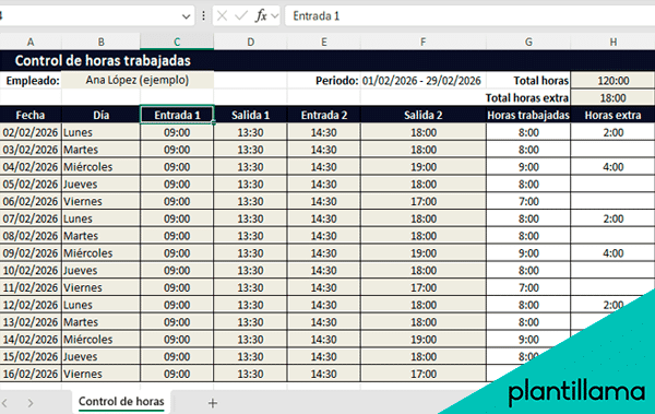 Planilla de control de horas trabajadas con cálculo automático de jornada diaria y horas extra a partir de las entradas y salidas.