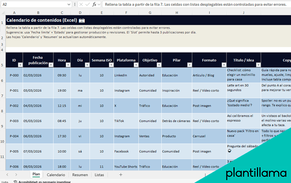 Para rellenar esta plantilla, empieza por la hoja Plan y crea cada contenido como una fila: define la fecha y hora, el canal (Instagram, TikTok, LinkedIn, etc.), el formato (reel, carrusel, historia, post), el objetivo (alcance, interacción, tráfico, leads) y el pilar de contenido (educativo, inspiracional, producto, comunidad).