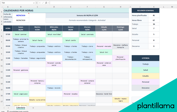 Incluye ejemplos prácticos y cálculos automáticos para entender mejor la distribución del tiempo y las horas planificadas.