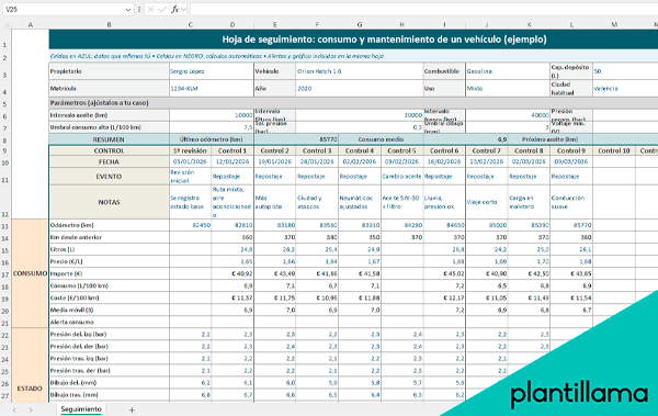 Registro de viajes y gastos del vehículo con columnas automáticas (mes, km recorridos, consumo y coste por km) y validaciones para evitar errores de captura.
