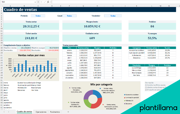 Después, revisa la parte visual del documento como tu panel de control. Ahí podrás consultar de un vistazo métricas como ventas totales, ticket medio, unidades vendidas, cumplimiento de objetivos y comportamiento por periodo, categoría o vendedor.
