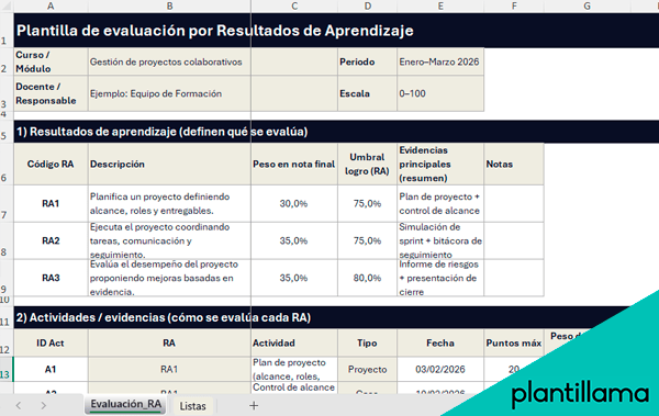 Hoja de cálculo para evaluar estudiantes por resultados de aprendizaje, con pesos configurables, criterios mínimos y resumen automático de logro por RA.
