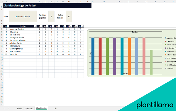 A medida que vayas cargando resultados, la pestaña Clasificacion se actualizará sola con la tabla: partidos jugados, victorias, empates, derrotas, goles a favor, goles en contra, diferencia de goles y puntos, de forma que puedas seguir el liderato y la evolución de cada equipo sin tocar nada más.