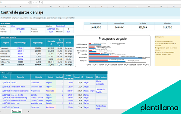 Hoja de cálculo para controlar gastos de viaje con presupuesto por categorías, seguimiento de importe usado y saldo disponible.