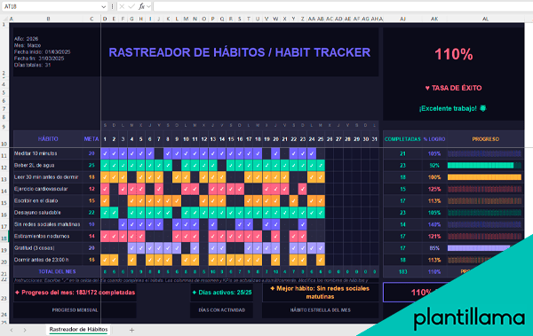 Incluye métricas automáticas de logro, tasa de éxito global y un panel de KPIs motivacionales para mantener la constancia a lo largo del mes.