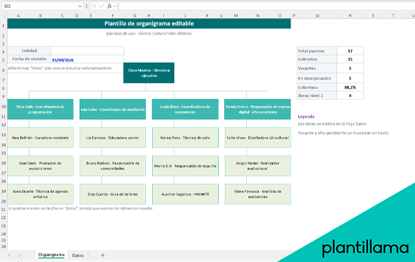 Permite visualizar puestos, responsables y estado de cobertura de forma intuitiva, útil para adaptar a cualquier equipo u organización.