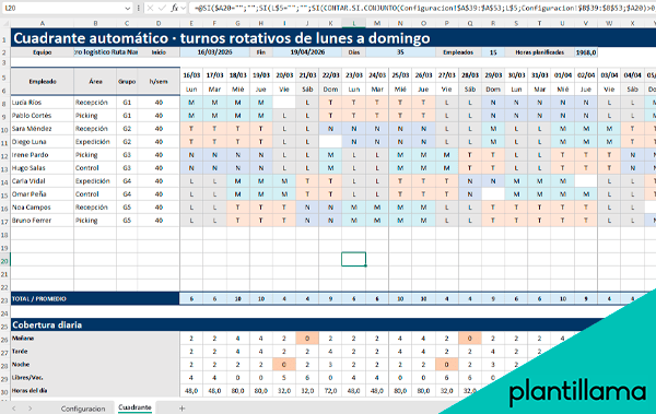 Incluye planificación diaria de mañanas, tardes y noches, junto con el cálculo de cobertura y horas totales.