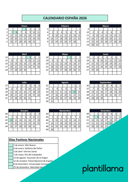 Descargar calendario España 2026 con semanas en PDF