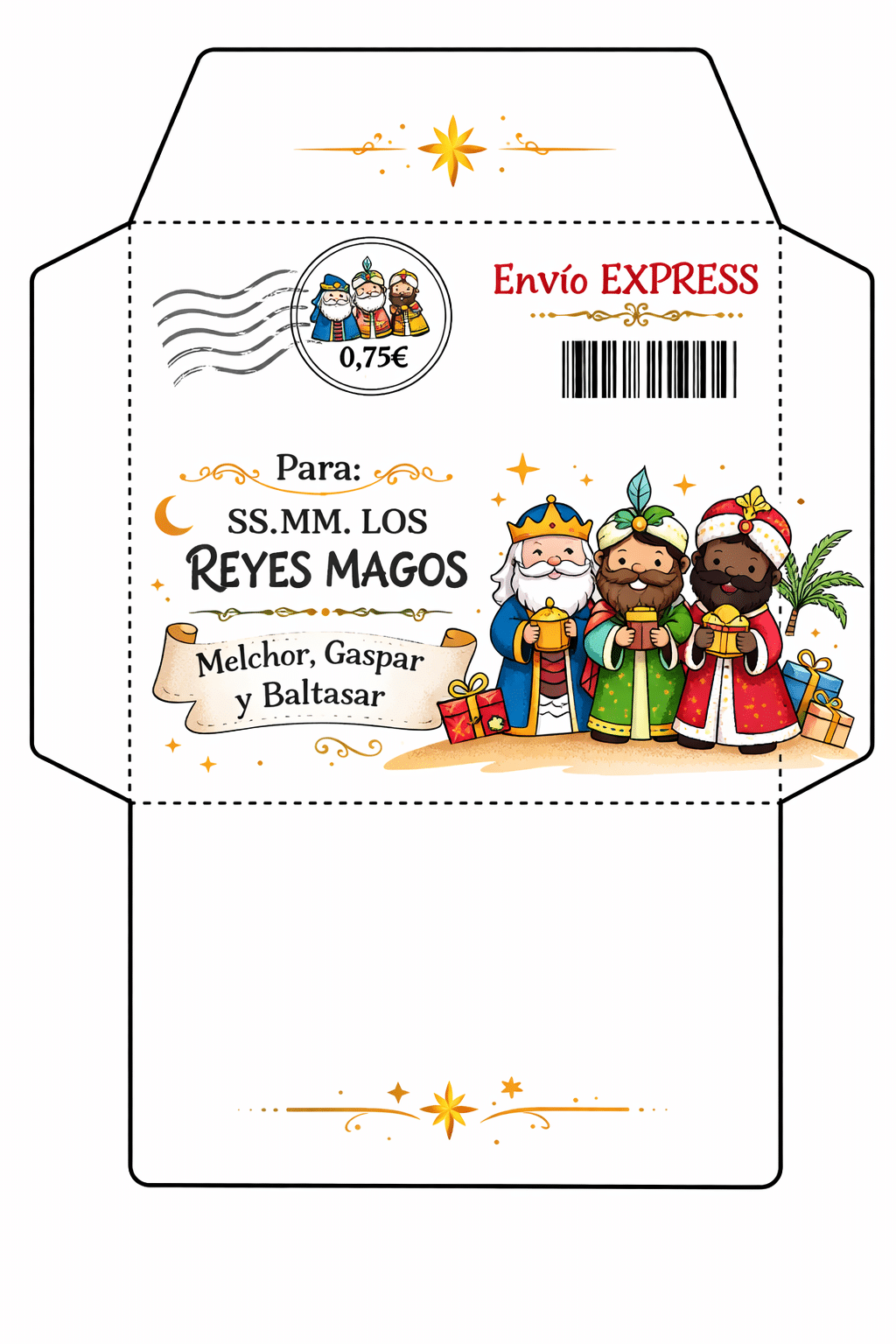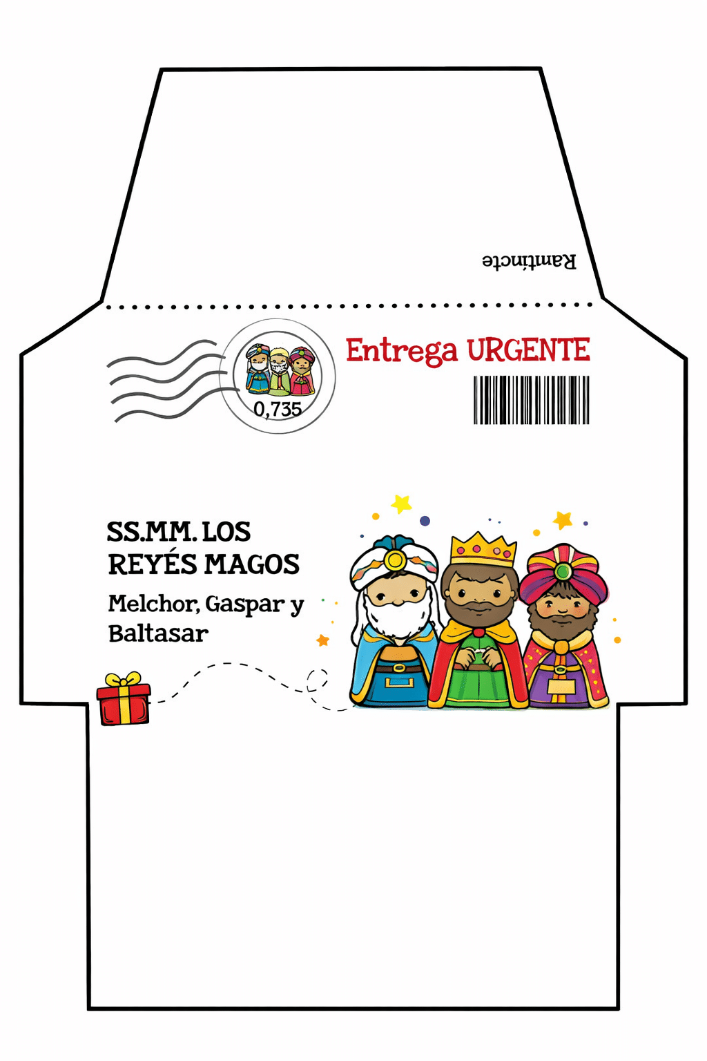 Sobre de carta a los reyes magos con estilo postal, en fondo blanco, que incluye un sello redondo, líneas de matasellos y un código de barras. En la parte central se ven los tres Reyes Magos juntos y a un lado aparece el texto con sus nombres.