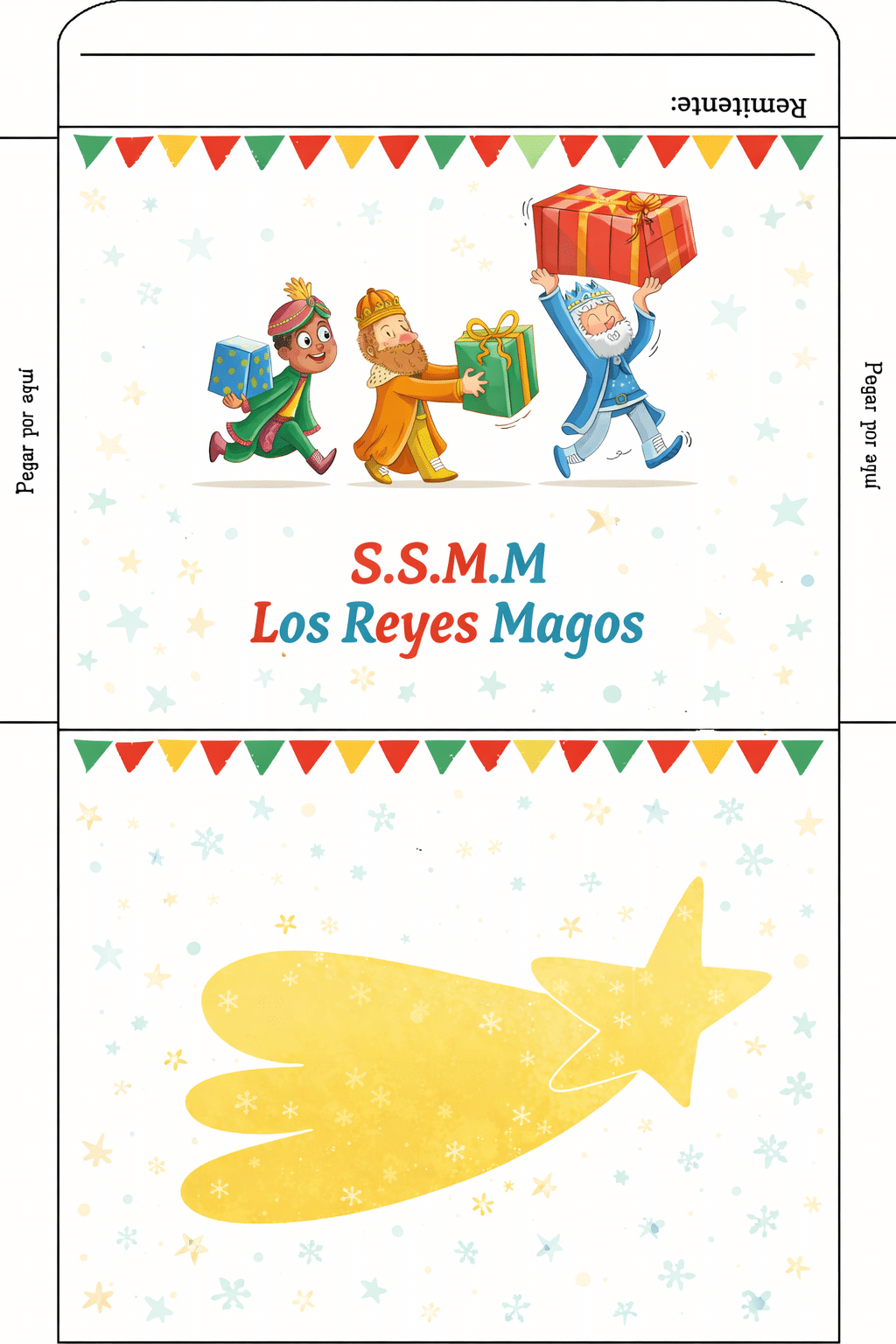 Sobre de sus majestade los reyes magos con diseño festivo, decorado con guirnaldas de colores en la parte superior y fondo claro con estrellas. En el centro aparecen tres personajes caminando y cargando regalos, y en la parte inferior destaca una gran estrella fugaz amarilla.