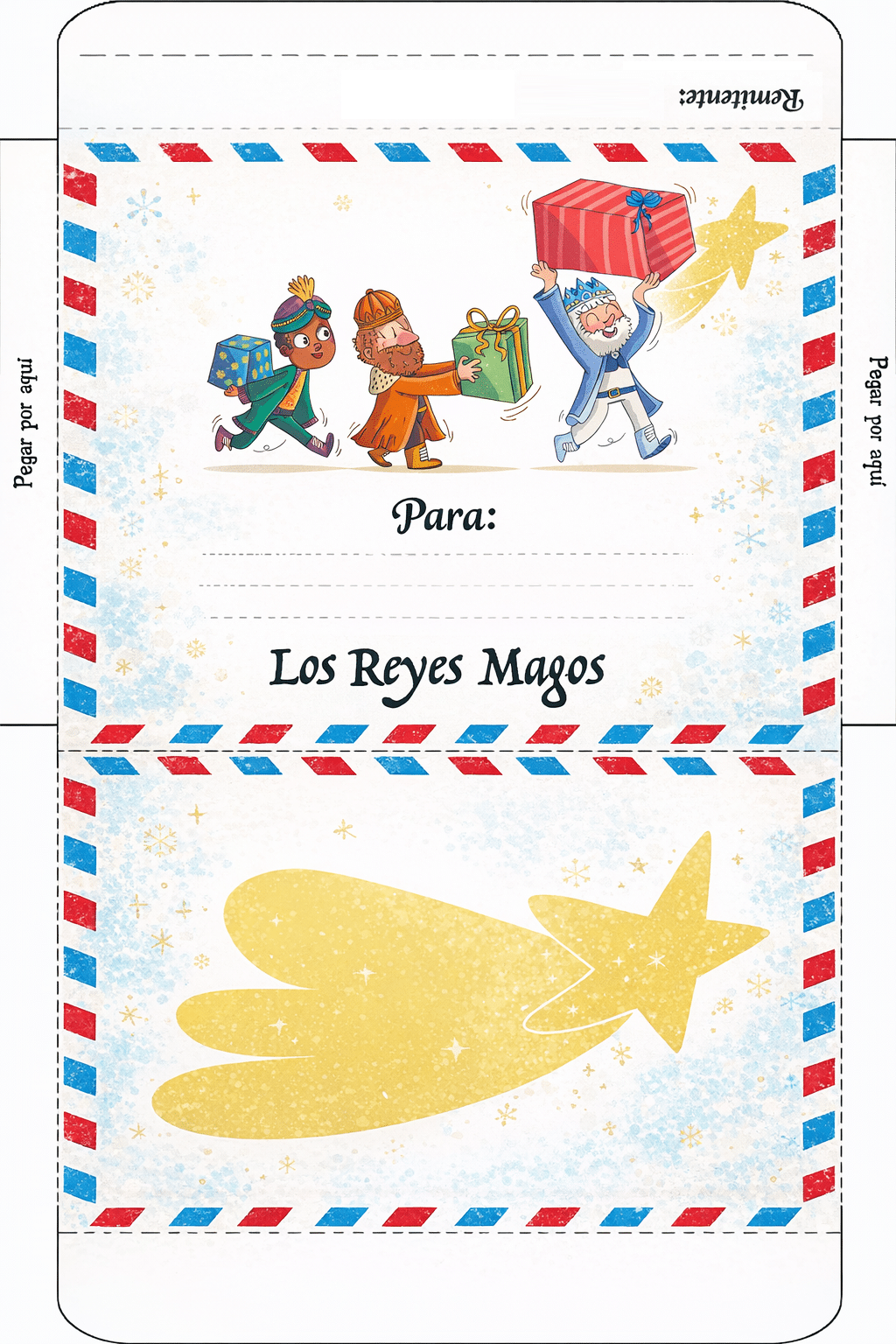 Sobre de reyes magos con diseño tipo carta aérea, con borde en rojo y azul. En la parte superior aparecen los Reyes caminando con regalos y en el centro hay un espacio para escribir el destinatario.