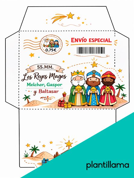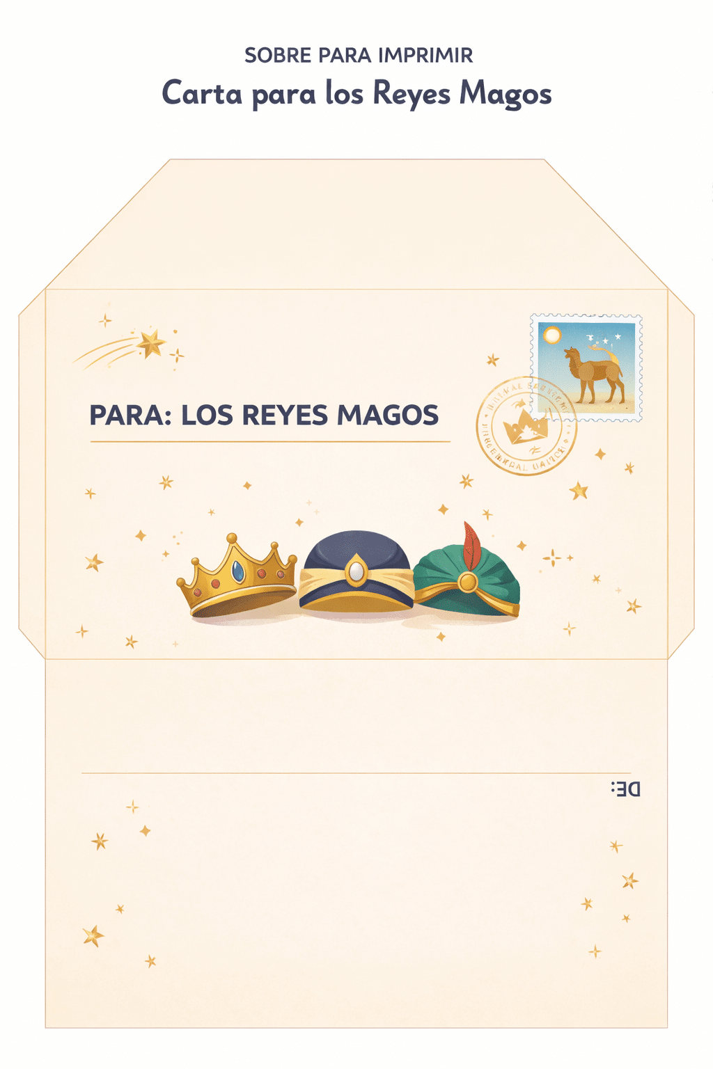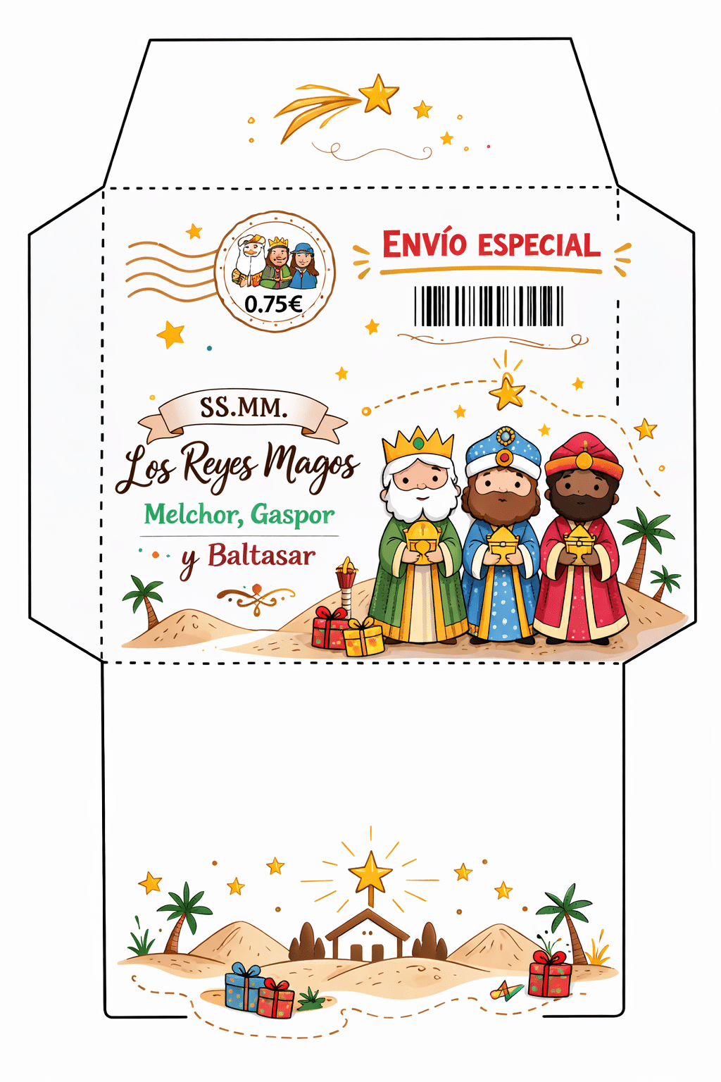 En esta página podrás descargar gratis varios sobres de Reyes Magos para imprimir, con diseños listos para usar en casa. Además, se explica cómo recortarlos, montarlos y utilizarlos correctamente para entregar la carta de forma especial.