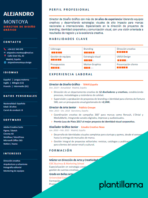 Plantilla de CV de diseñador gráfico con perfil senior orientado a dirección creativa, branding y comunicación visual. El diseño ayuda a destacar experiencia en agencias, liderazgo de equipos, software de diseño y proyectos de alto impacto.