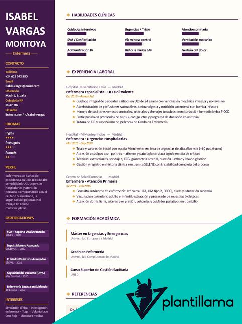 Este currículum de enfermera destaca por su diseño potente y diferenciador, pensado para perfiles con experiencia en UCI, urgencias y atención primaria.