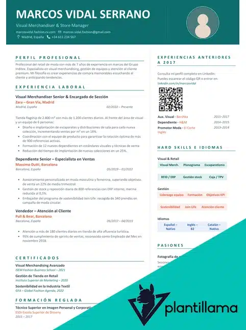 Entre estas plantillas, este modelo funciona muy bien si ya tienes experiencia en retail y quieres destacar resultados, objetivos de venta, atención personalizada y gestión de tienda.