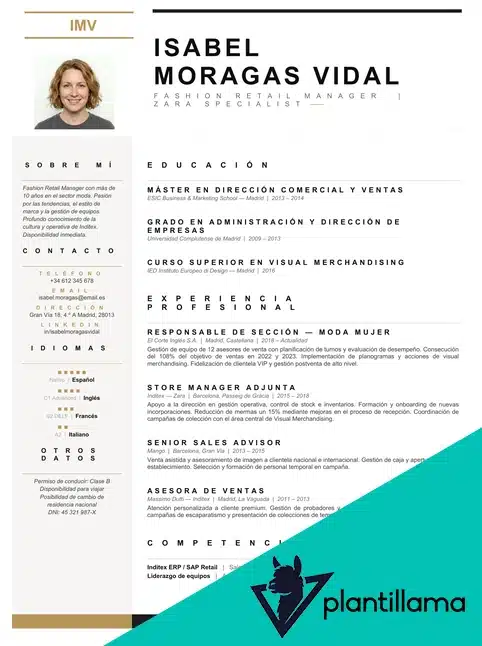 Ofrecemos varias plantillas para que puedas enseñar tu trayectoria en moda de forma clara, con espacio para logros, competencias e idiomas.