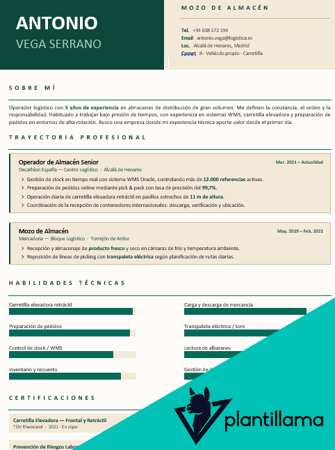 Puede usarse como referencia para adaptar el CV a vacantes de almacén, picking, expediciones o recepción de mercancía.