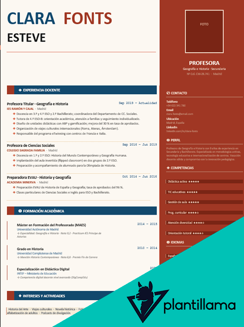 Modelo de currículum para profesor de secundaria con una estructura moderna que da protagonismo a la trayectoria en el aula, las competencias pedagógicas y los idiomas.