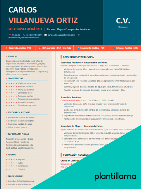 Plantilla de currículum de socorrista acuático con perfil profesional orientado a piscinas municipales, playas y clubes privados en Valencia. Destaca la experiencia en vigilancia, rescate acuático, RCP y control de la calidad del agua, además de una formación sólida en emergencias.